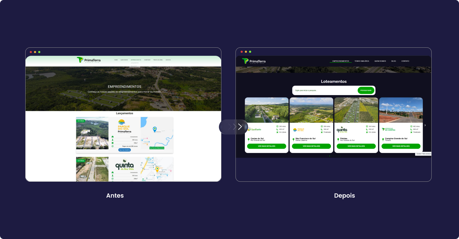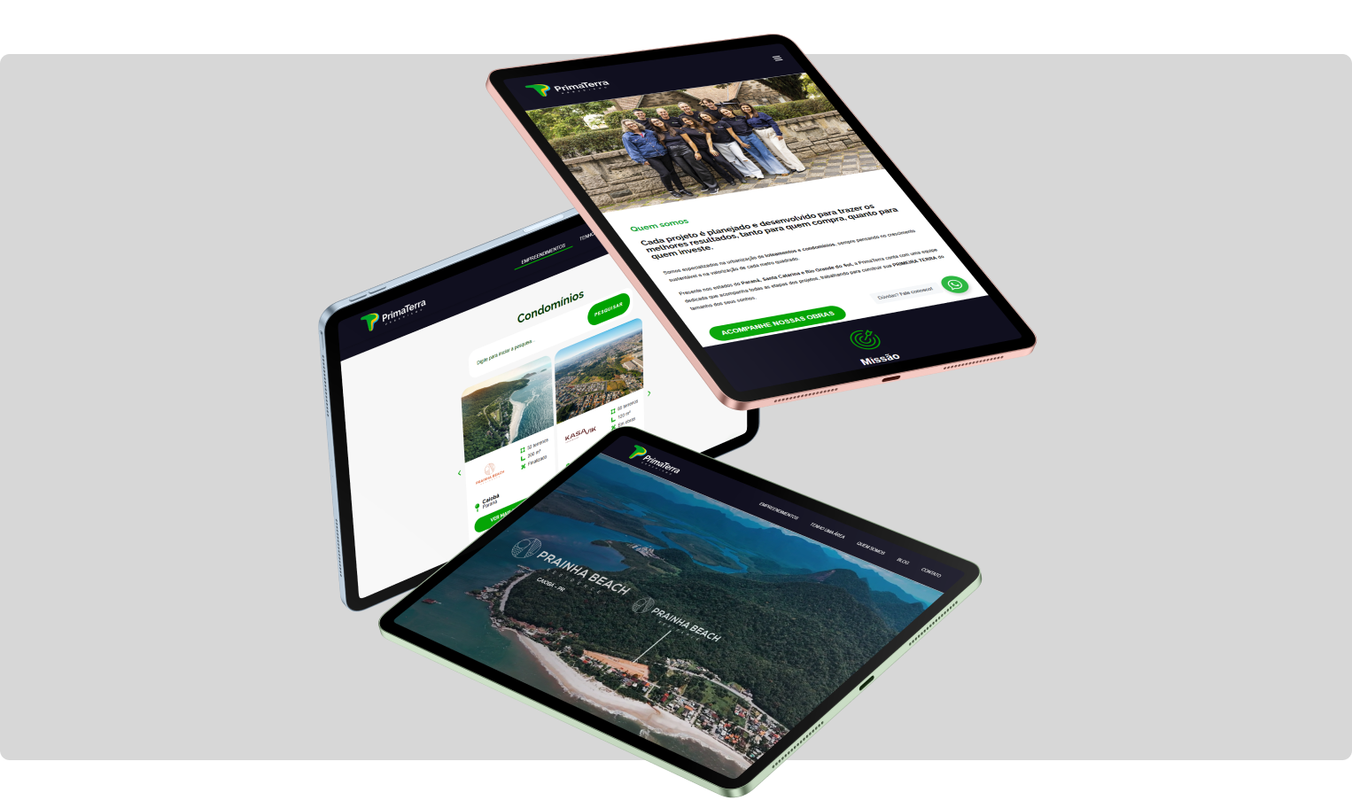 Para construir o site PrimaTerra, a equipe optou por uma estética clean e elegante, criando uma navegação intuitiva que destacasse o portfólio de empreendimentos de forma profissional e sofisticada. Trabalhamos com uma linguagem clara e sofisticada, priorizando a apresentação visual dos projetos através de recursos interativos e layouts responsivos.